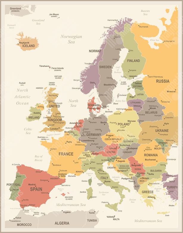 Magnetic map of Europe, vintage, colored